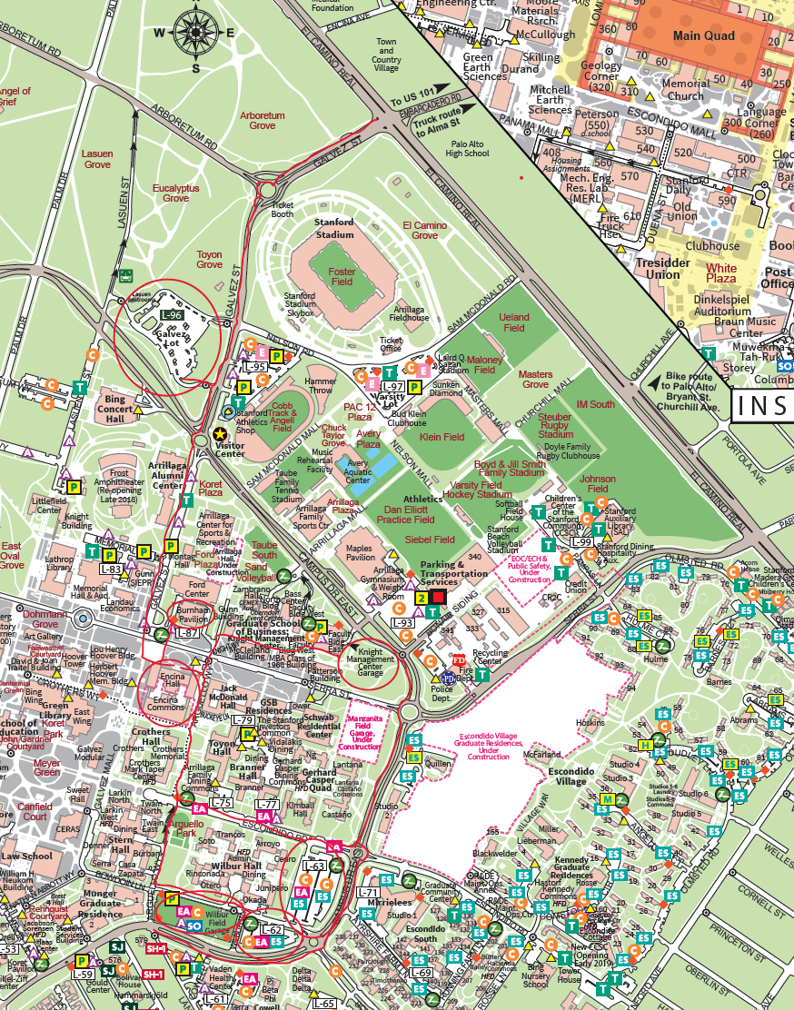 The Knight Management Center parking garage is close to Encina and it’s easy find the garage. Entry to this garage is on Campus Drive East, across from Maples Pavilion. Take the stairs or elevator to the first floor, make your way out of the quad to Jane Stanford Way [formerly Serra Street] and walk towards Hoover Tower.) However, you won’t need to look for fencing to identify Encina this time. You will now know it by the beautiful oval lawn.